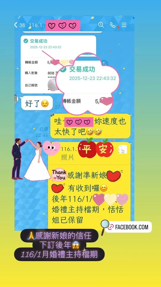 感謝 新人的喜愛 下訂115/9月婚禮主持檔期 喜歡要趁早下訂唷~以免好日子被搶走~檔期預約中歡迎line詢問服務細節